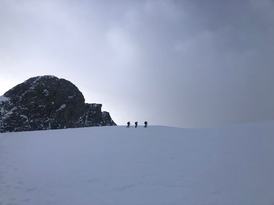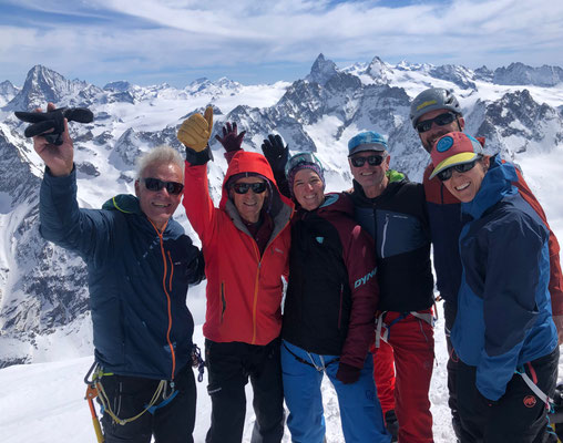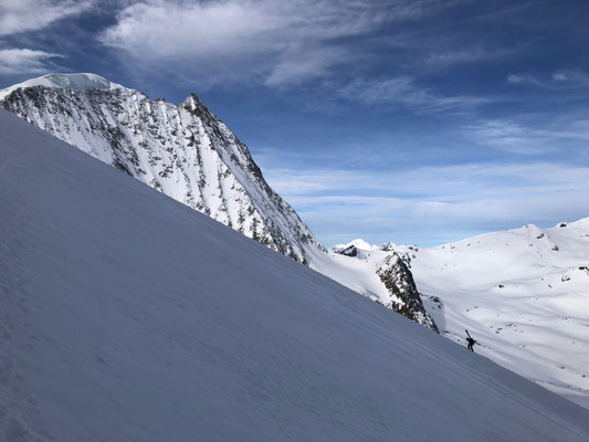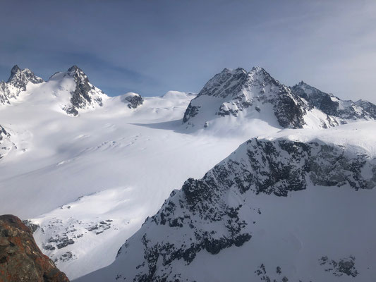 Tag 4: Wunderbarer Schlusstag. Sanft aufsteigend erreichen wir auf die Tete Blanche (3‘551m). Bereits ist das Mattertal sichtbar. In einer langen und genüsslichen Abfahrt erreichen wir Zermatt.